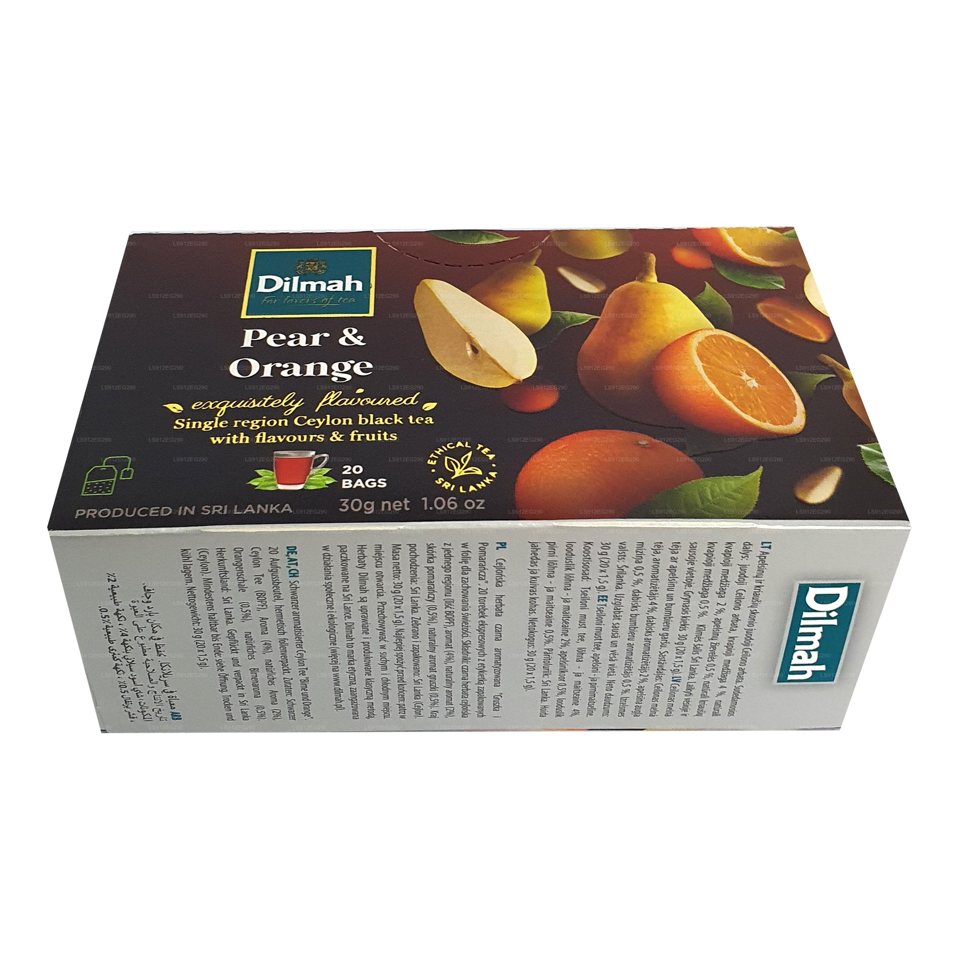 (SKU: LS912EG290) Dilmah's Pear and Orange Flavored Ceylon Black Tea presents a delightful fusion of taste and aroma. With 20 tea bags containing 30g of premium Ceylon Black Tea, it offers a harmonious blend of succulent pear and zesty orange notes. Each sip is a refreshing journey, balancing the rich depth of Ceylon tea with the bright sweetness of pear and the tangy zest of orange. Whether enjoyed hot or cold, this tea promises a unique sensory experience that captures the essence of natural flavors. A harmonious infusion that caters to tea enthusiasts seeking a vibrant and flavorful cup.
