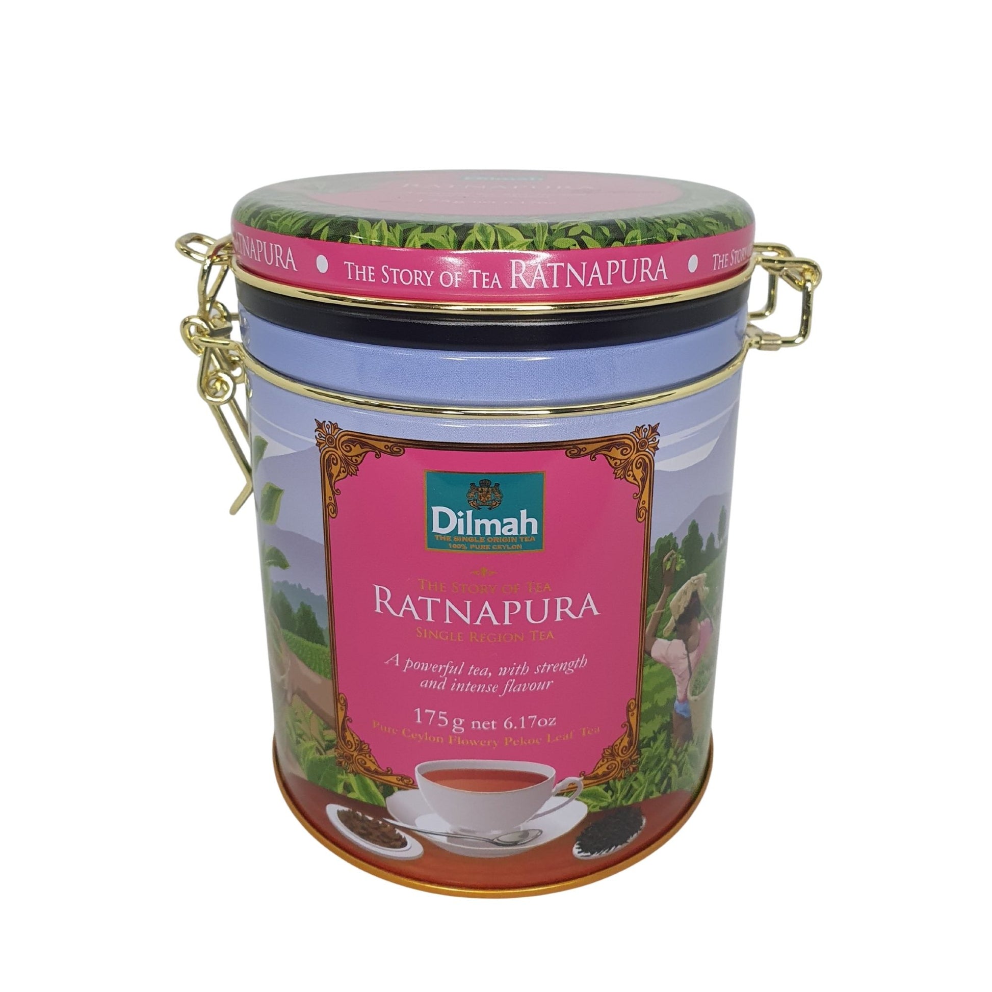 Dilmah The Story Of Tea Rathnapura (175g) Tea Caddy is a robust single-region Ceylon tea grown in the low elevations of Wellandura Estate near the gem-rich city of Ratnapura, Sri Lanka. At 531 feet above sea level, this region produces bold teas with a deep, earthy character. The shotty black Pekoe leaf yields a chocolate-brown infusion, offering a medium to full-bodied cup with rich, intense flavour. This powerful flowery Pekoe tea stands out for its strength, depth, and earthy notes, making it an exceptional choice for those who enjoy a strong. Brew at 95°C–100°C for 3 to 5 minutes and store in a cool, dry place in an air-tight container after opening.