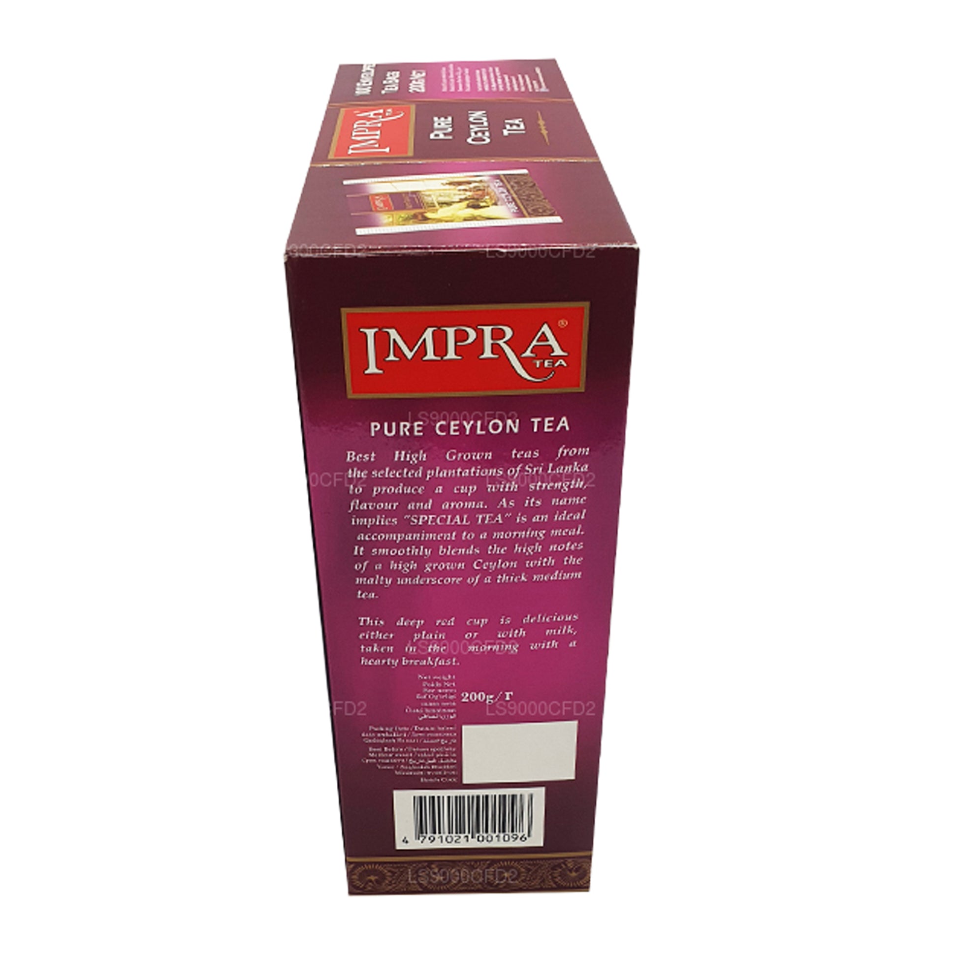 Impra Pure Ceylon Special Tea (100% Pure Celon Tea) comes from the best high grown teas and selected plantations of Sri Lanka to produce a cup with strength, flavor and aroma. As it's name implies "SPECIAL TEA" is an ideal accompaniment to a morning meal. It smoothly blends the high notes of a high grown Ceylon with a malty underscore of a thick medium tea.