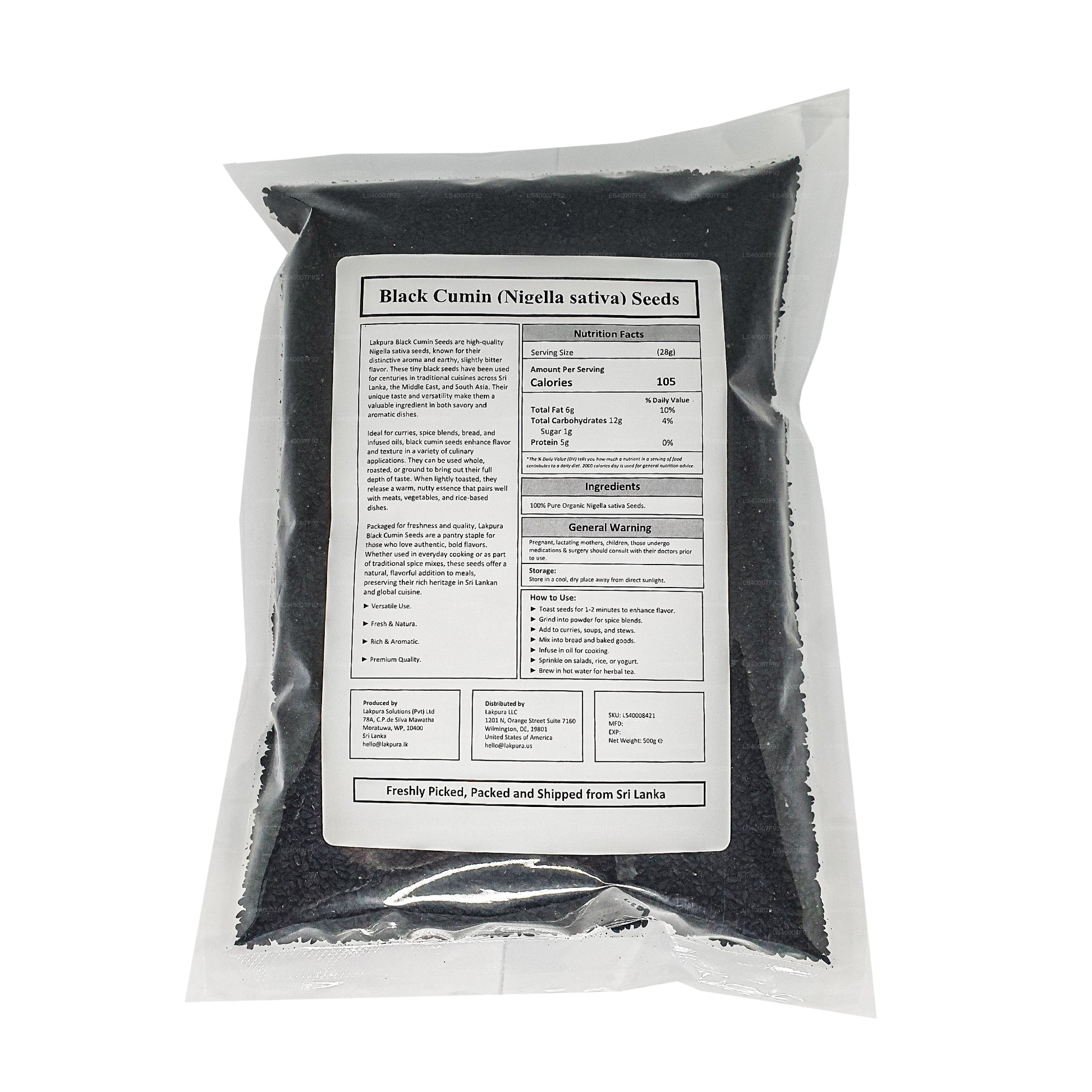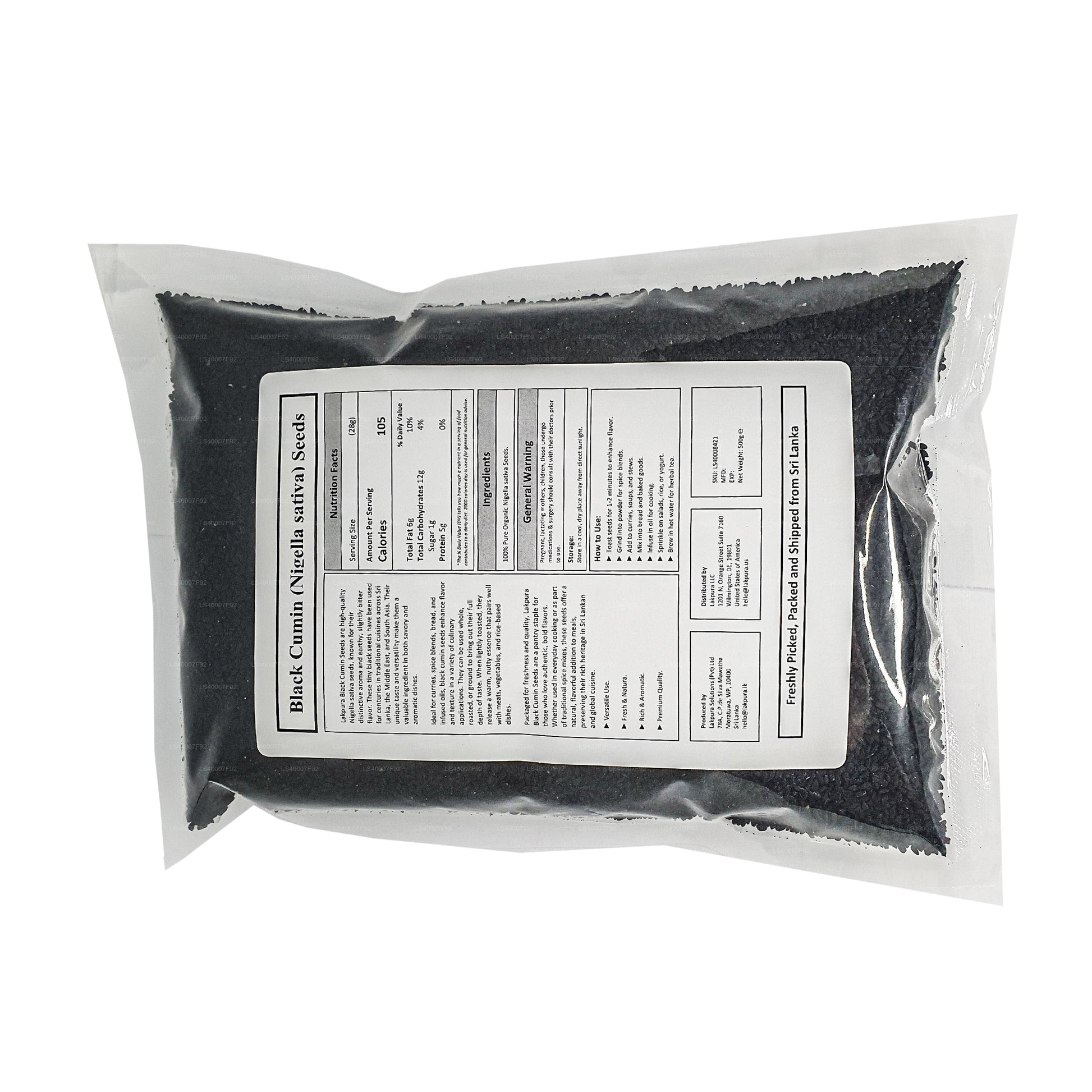 Lakpura Black Cumin Seeds are premium Nigella sativa seeds with a warm, nutty, and slightly bitter flavor. Ideal for curries, spice blends, bread, and infused oils, they can be used whole, roasted, or ground. Packaged for freshness and quality, they add rich flavor and traditional culinary value to various dishes.