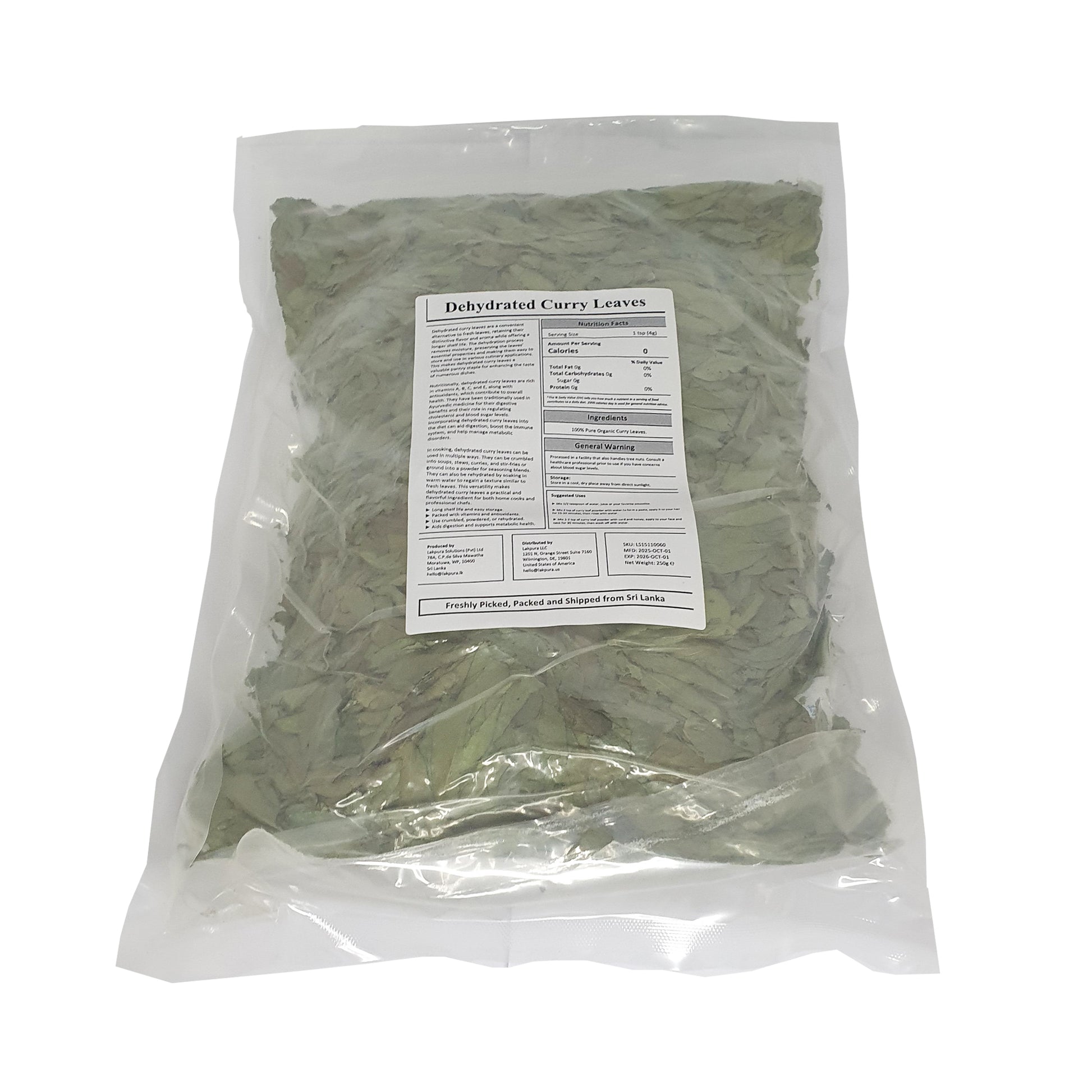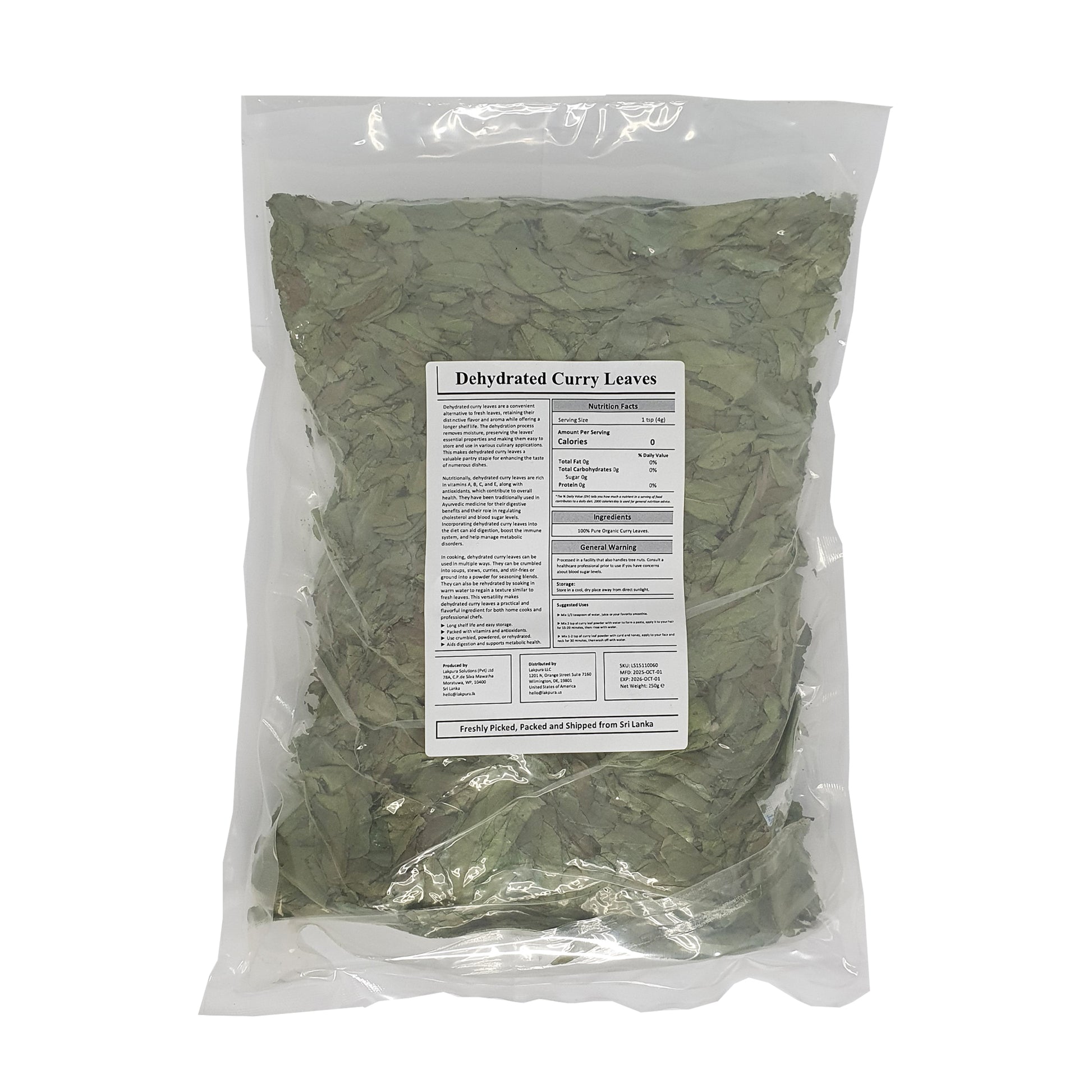 Lakpura® Curry Leaves korjatakse peamiselt koduaedadest ja väikestelt põllumajanduse aladelt, samas kui need sorteeritakse ja kuivatatakse rangetes hügieenitingimustes, tagades, et lehtede toitained ja aroomilised omadused ei kao. Curry lehed kuivatatakse, et pakkuda pikemat säilivusaega ilma nende toiteväärtusi kahjustamata. Need annavad väga ainulaadse maapinna tsitruselise lõhna, kui neid kasutatakse karri, chutneyde, praadimiste ja isegi suppide valmistamisel.