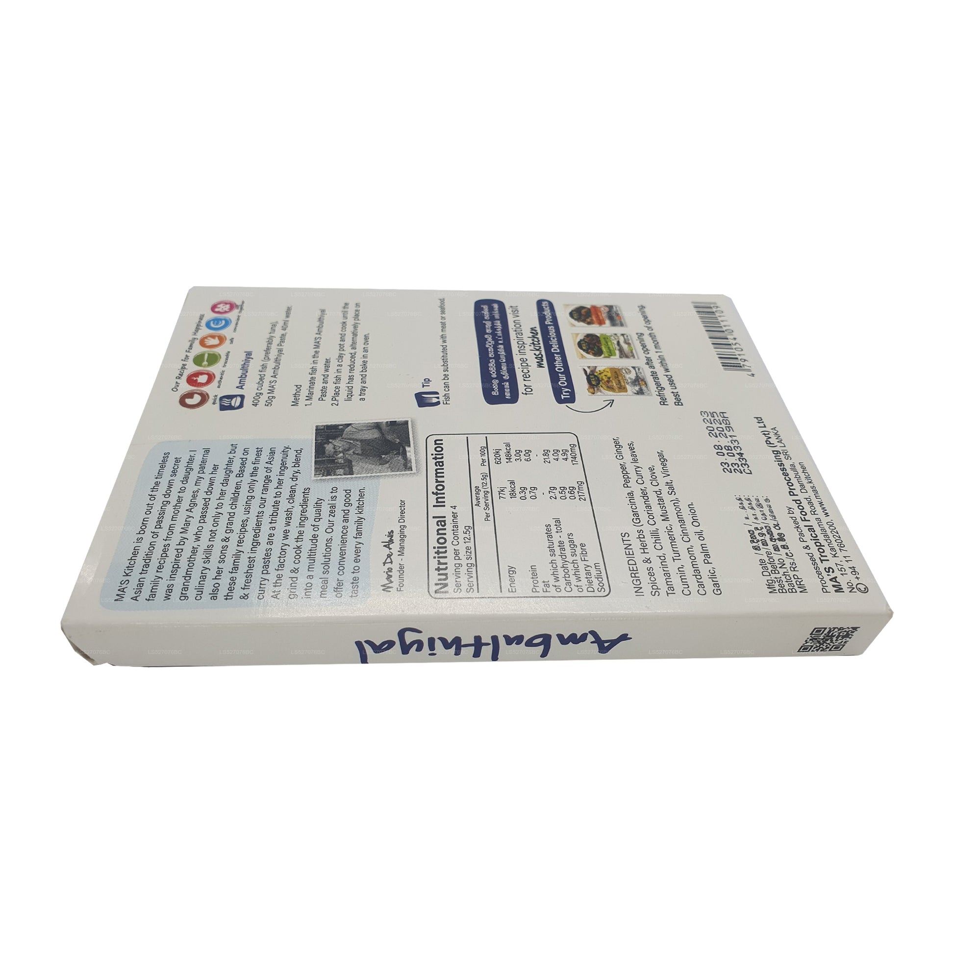(SKU: LS527076BC) MA's Kitchen Fish Ambulthiyal Paste (50g) brings the authentic taste of Sri Lanka's coastal cuisine to your kitchen. This convenient paste combines premium spices and natural ingredients to create the traditional Ambulthiyal flavor. Versatile and time-saving, it's perfect for marinating and cooking a variety of fish dishes. Free from preservatives, this 50g jar delivers a zesty and tangy experience, capturing the essence of Sri Lankan culinary heritage. Elevate your seafood creations with MA's Kitchen Fish Ambulthiyal Paste.