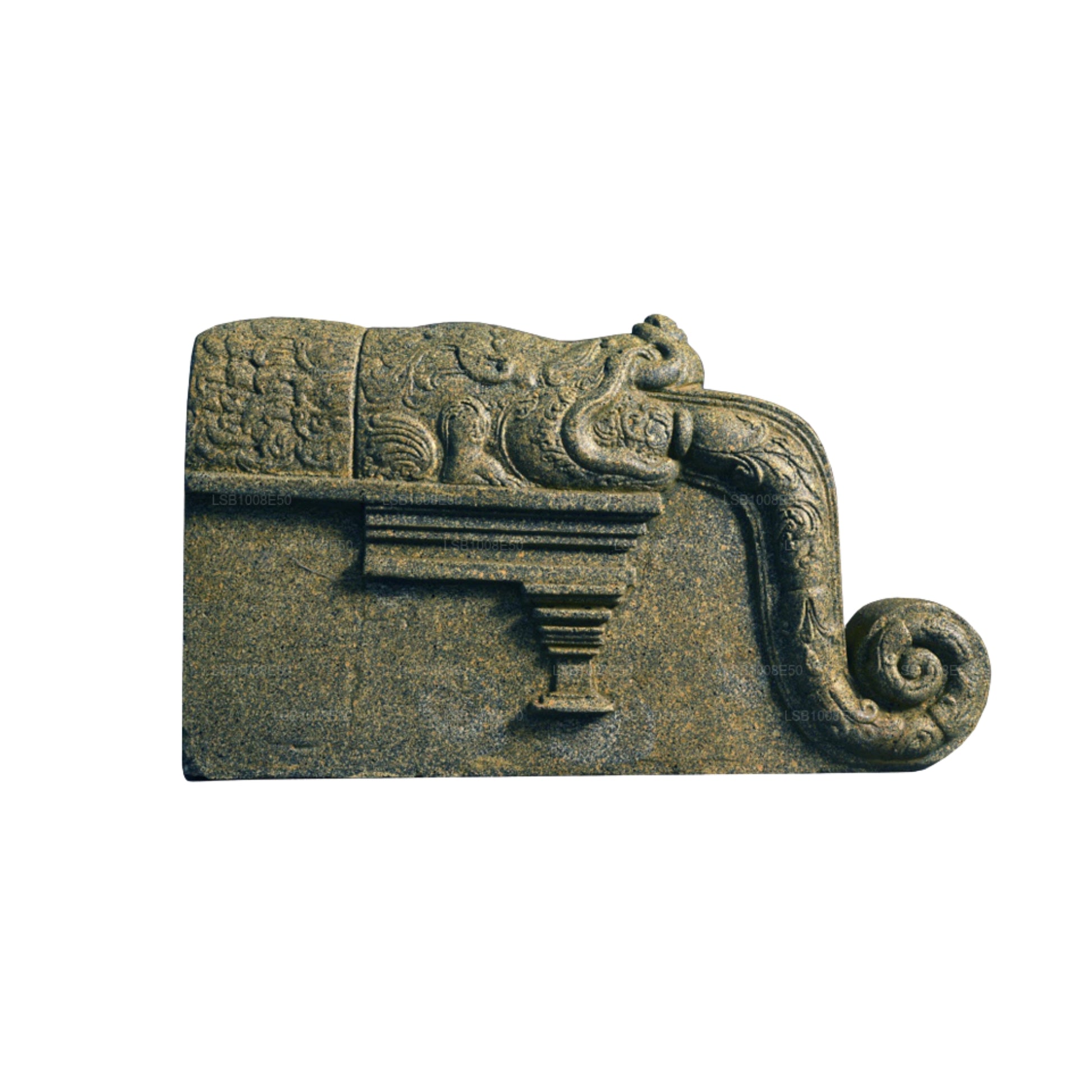 The balustrade is adjacent to the stairway of the Vatadage, which forms part of the Quadrangle at the ancient site of Polonnaruwa in Sri Lanka. The dragon has the body parts of six animals. This traditional replica represents the ancient balustrade stone.