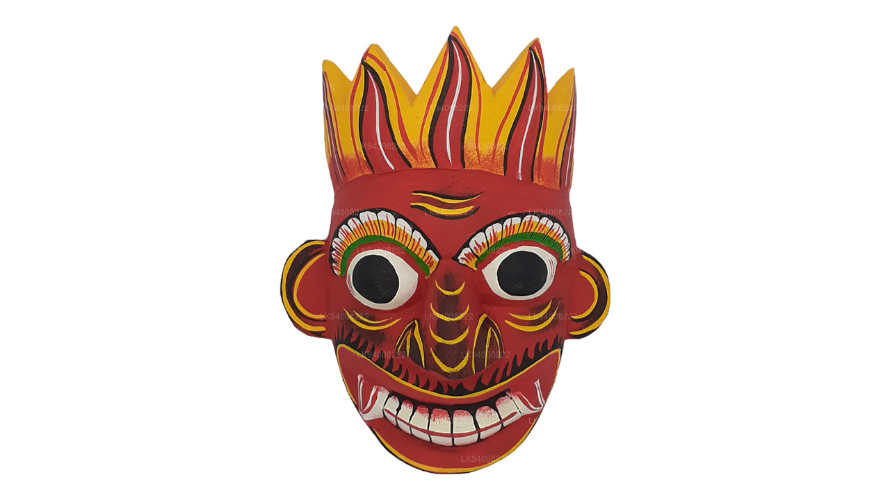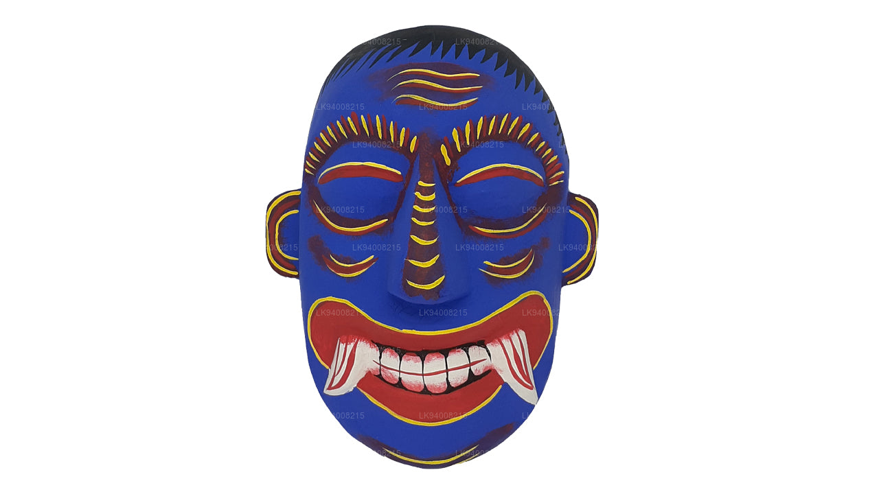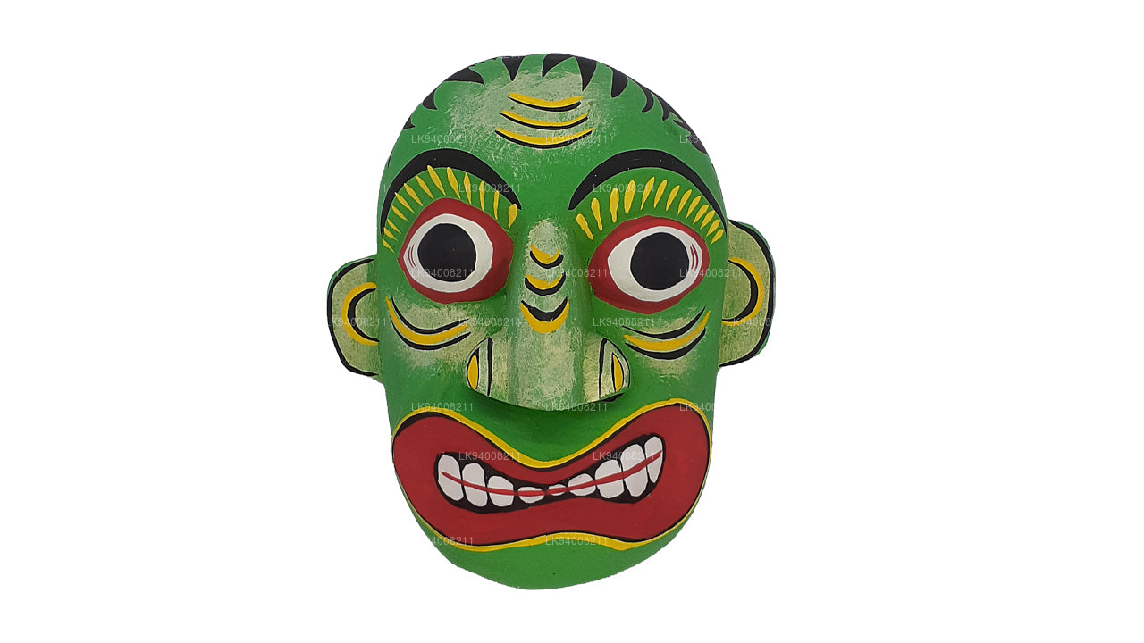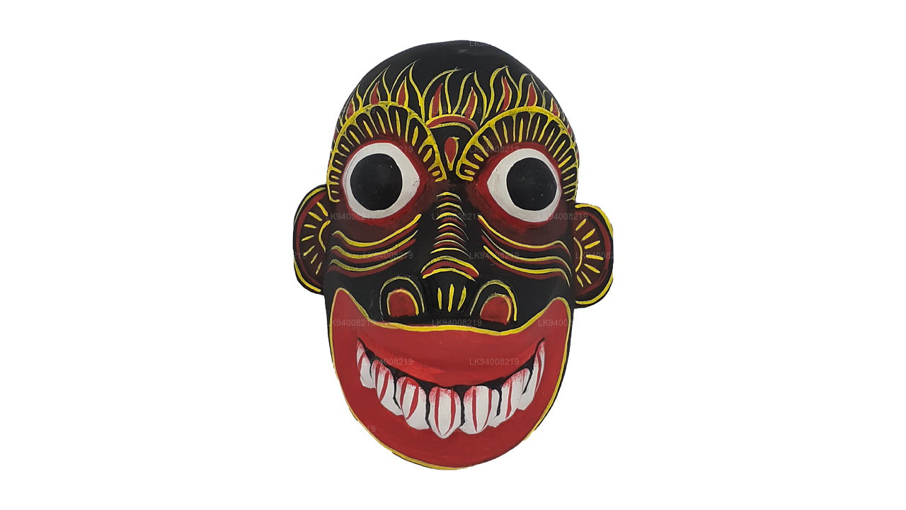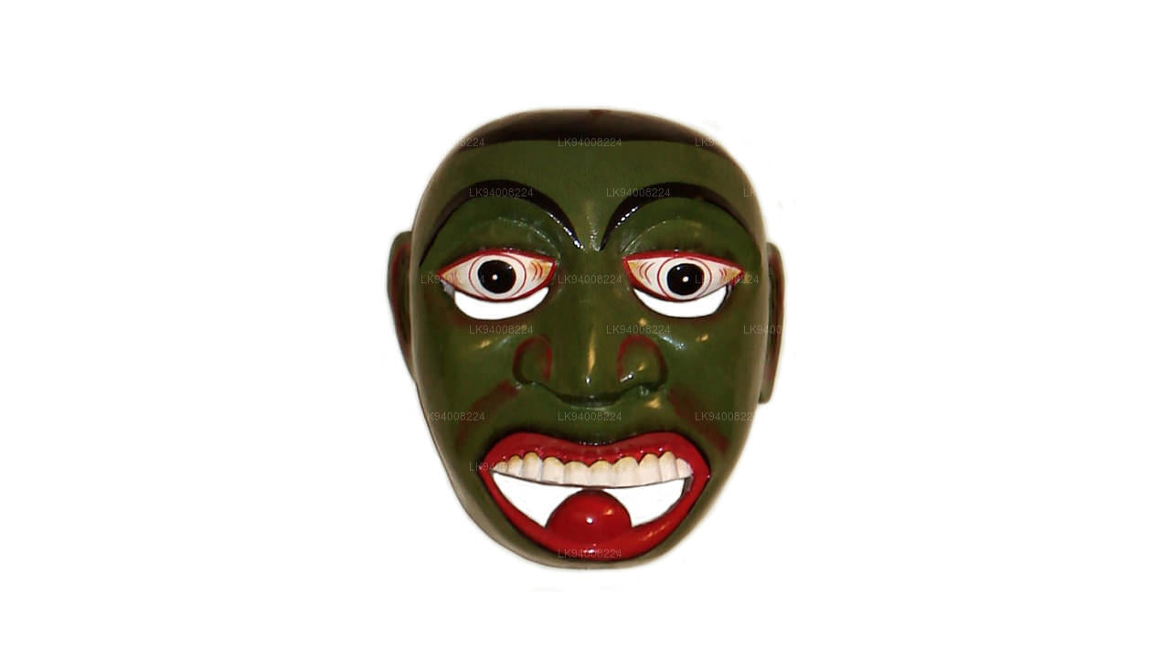 The Pissu Sanniya Mask is a traditional Sri Lankan mask handcrafted from 100% Kaduru wood, skillfully carved and painted by local artisans. This mask, a part of the well-known Sanni Yakuma ritual, represents the demon associated with mental illness or madness . In the image, the mask features an exaggerated expression with bulging red-rimmed eyes, large tusk-like teeth, and a wide-open red mouth with a protruding tongue, all designed to vividly depict chaos and mental disturbance. The use of intense colors like fiery red, black, and vivid green symbolizes energy, heat, and spiritual force, echoing the ancient belief in the power of colors to influence human well-being.