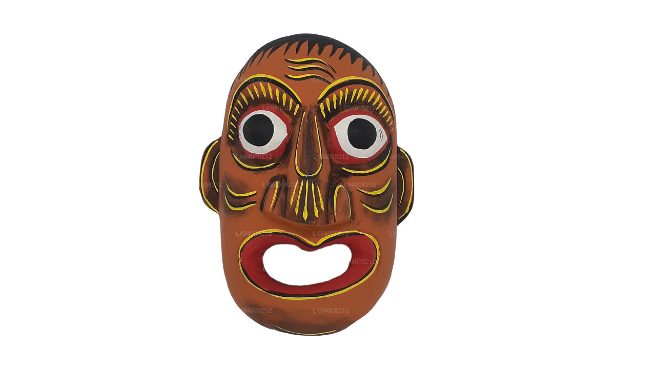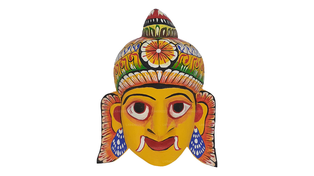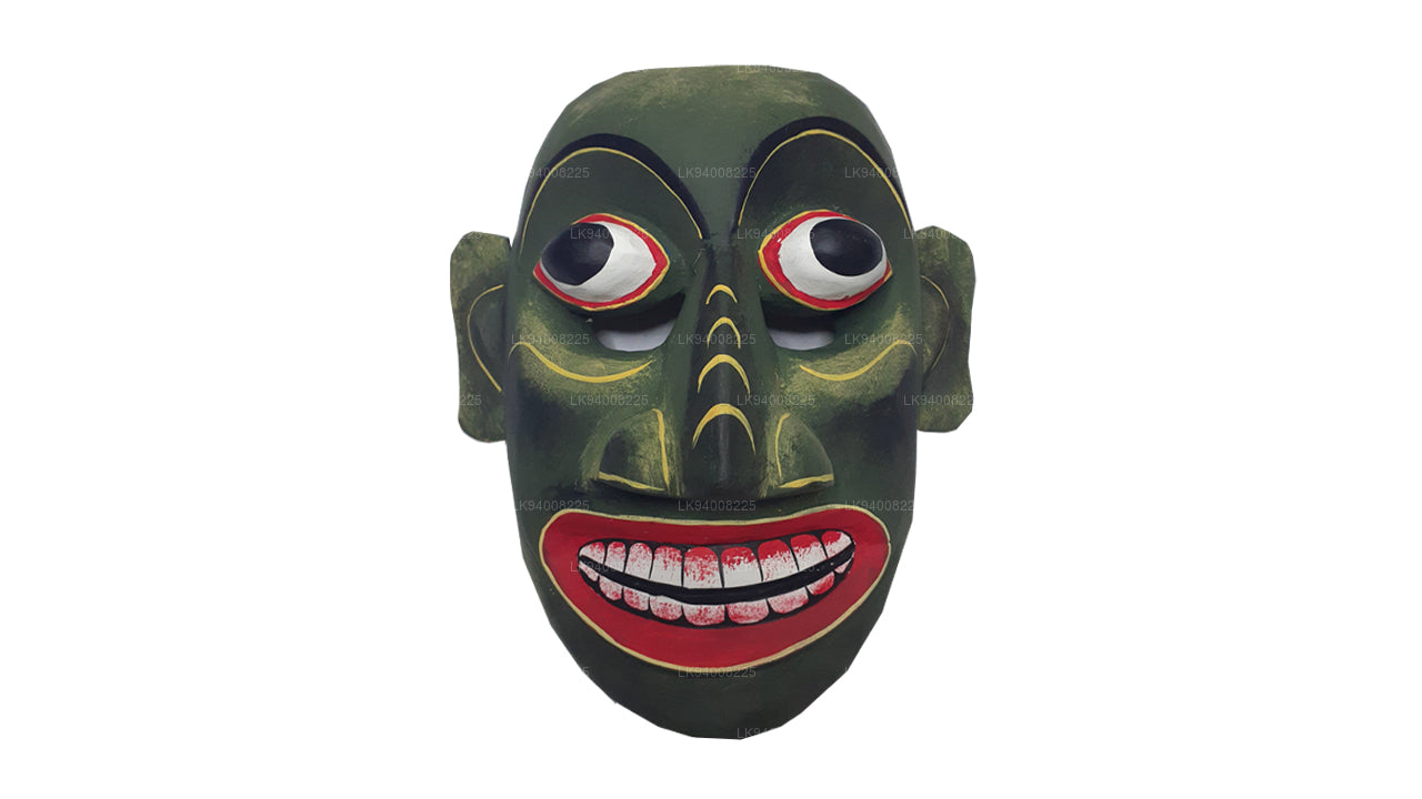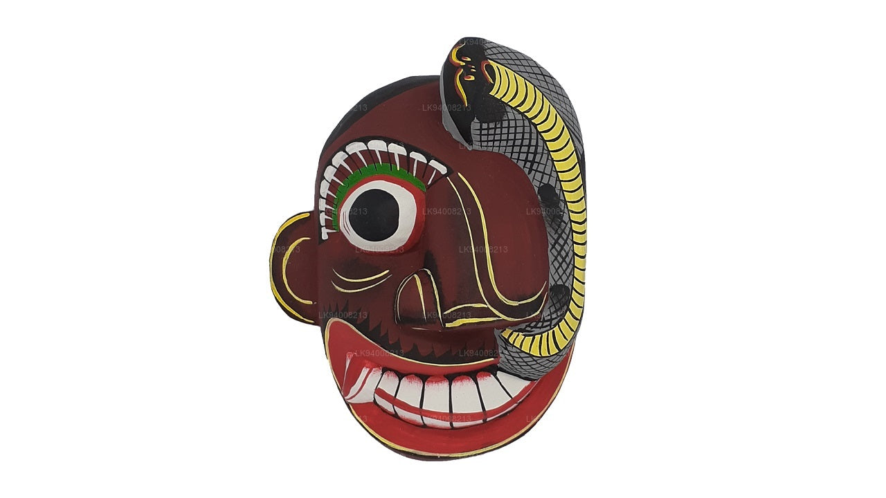 The Pissu Sanniya Mask is a traditional Sri Lankan mask handcrafted from 100% Kaduru wood, skillfully carved and painted by local artisans. This mask, a part of the well-known Sanni Yakuma ritual, represents the demon associated with mental illness or madness . In the image, the mask features an exaggerated expression with bulging red-rimmed eyes, large tusk-like teeth, and a wide-open red mouth with a protruding tongue, all designed to vividly depict chaos and mental disturbance. The use of intense colors like fiery red, black, and vivid green symbolizes energy, heat, and spiritual force, echoing the ancient belief in the power of colors to influence human well-being.