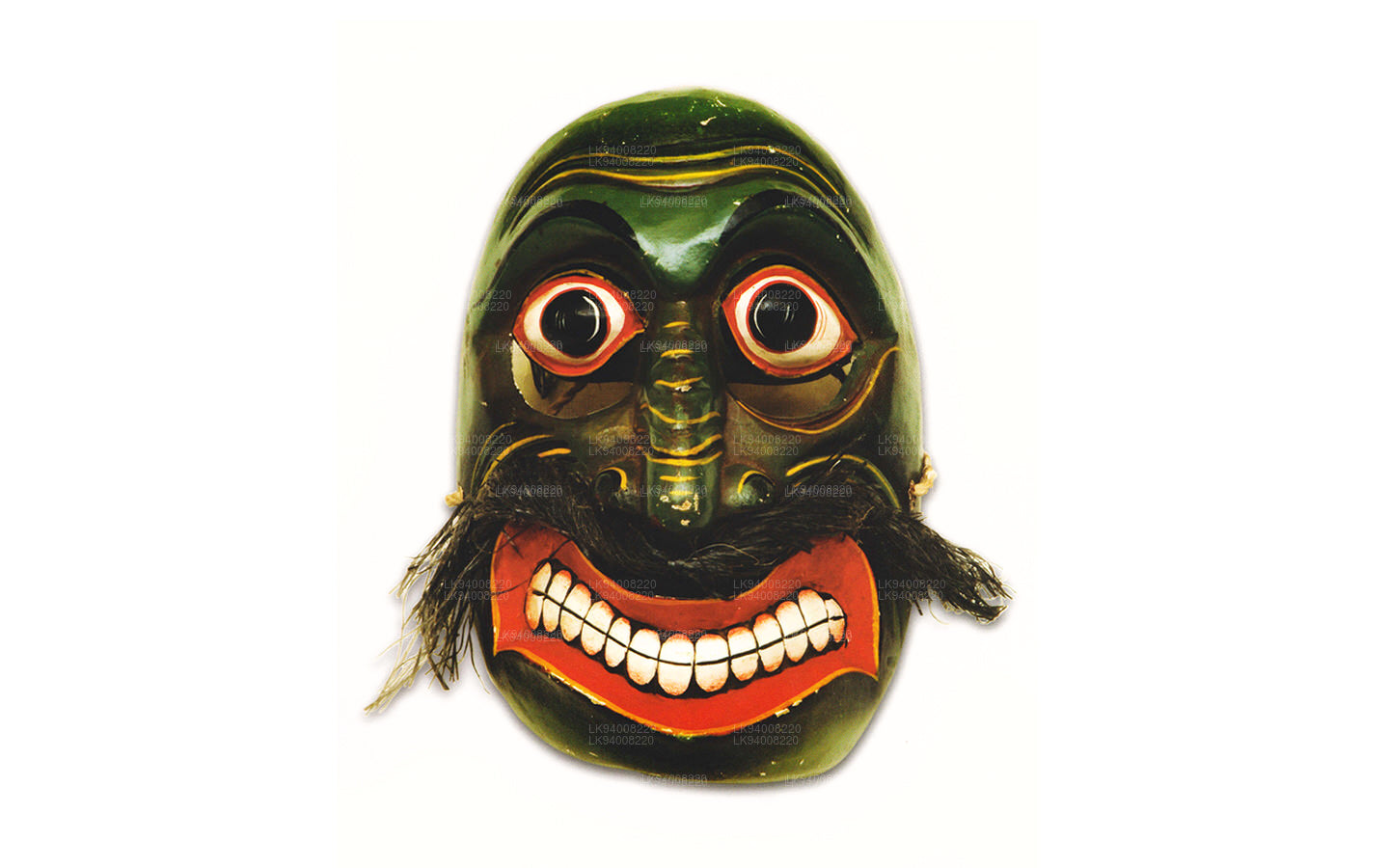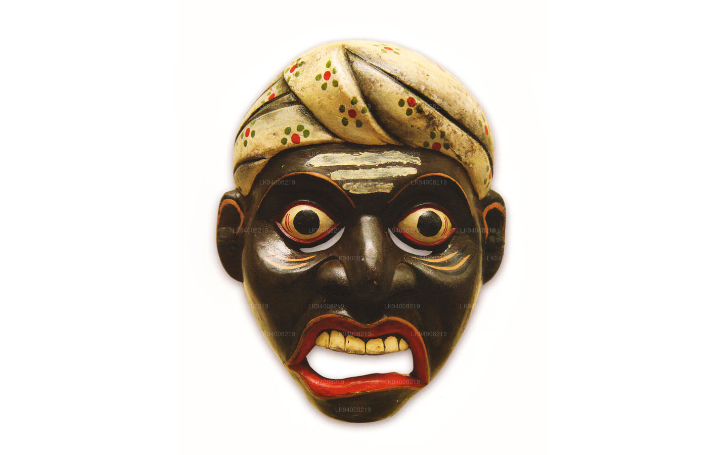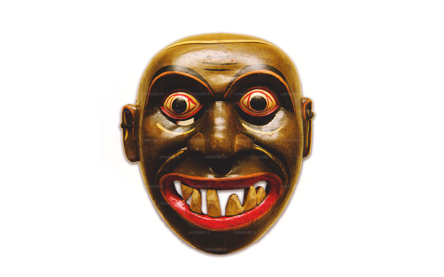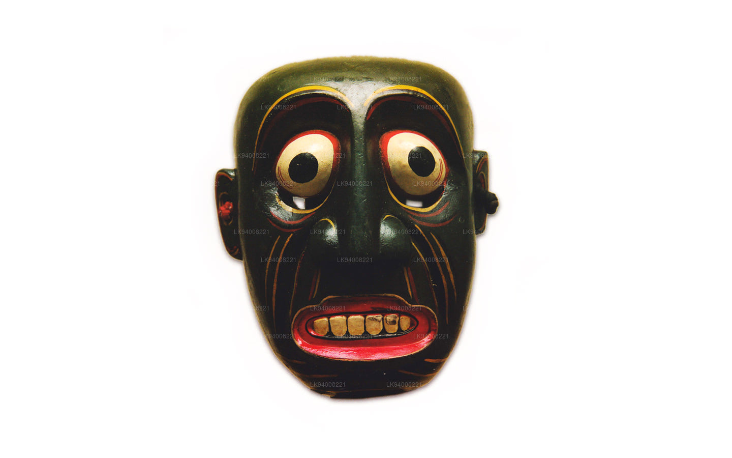 The Pissu Sanniya Mask is a traditional Sri Lankan mask handcrafted from 100% Kaduru wood, skillfully carved and painted by local artisans. This mask, a part of the well-known Sanni Yakuma ritual, represents the demon associated with mental illness or madness . In the image, the mask features an exaggerated expression with bulging red-rimmed eyes, large tusk-like teeth, and a wide-open red mouth with a protruding tongue, all designed to vividly depict chaos and mental disturbance. The use of intense colors like fiery red, black, and vivid green symbolizes energy, heat, and spiritual force, echoing the ancient belief in the power of colors to influence human well-being.
