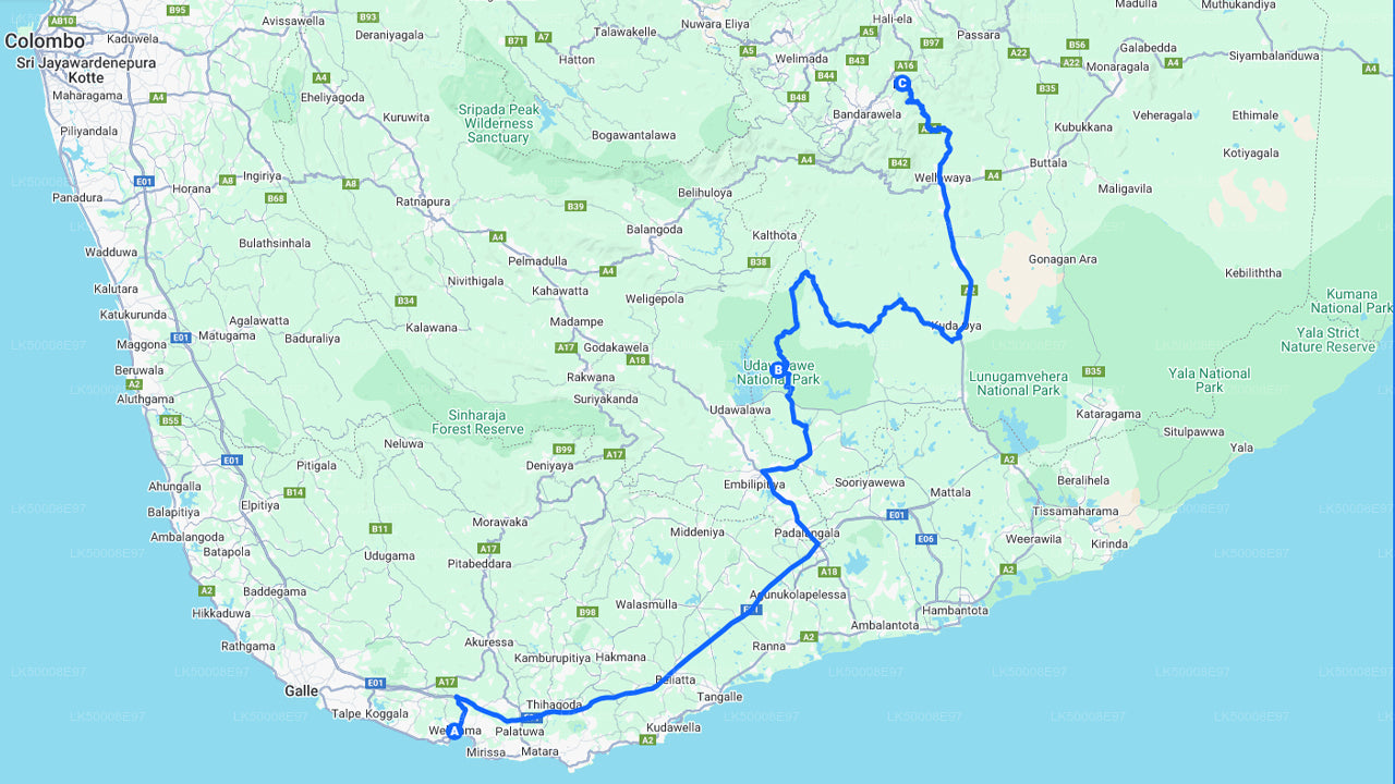Teie ringkäik algab Weligamast kell 12:00. Teie autojuht võtab teid hotellist peale ja sõidutab Udawalawe piirkonda. Seejärel suundute umbes kell 14:30 Udawalawe rahvusparki, kus kohtute oma safari-jeebiga 3-tunniseks sõiduks.