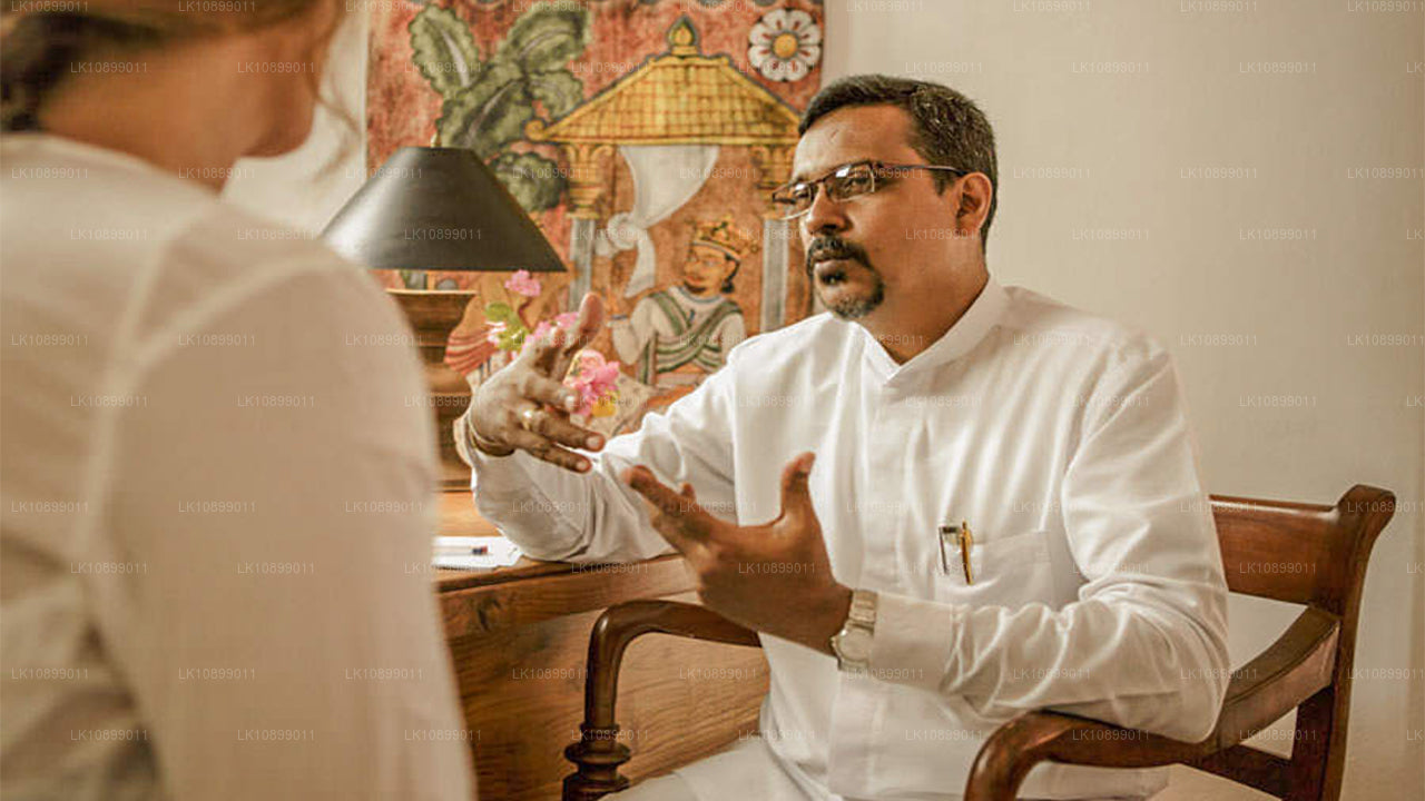 Esimesel päeval on teil esmane konsultatsioon arstiga meie Sri Lanka Ayurveda retriidil, mis kestab umbes 30 minutit. Selle konsultatsiooni käigus tuvastab arst teie prakurthi tasakaalu ja teie kolme dosha tasakaalustamatuse. Seejärel määrab arst raviprotseduuri ja toitumiskava, mis põhineb ajurveeda kontseptsioonides esitatud toiduväärtustel. Teile antakse järgimiseks joogaharjutuste ja meditatsiooni ajakava. Seejärel toimub igapäevane 10-minutiline järelkonsultatsioon meie ajurveeda arstiga, kes otsustab, kas peaksite jätkama sama raviga, muutma ravi kestust või muutma ravimeetodeid ja -protseduure.