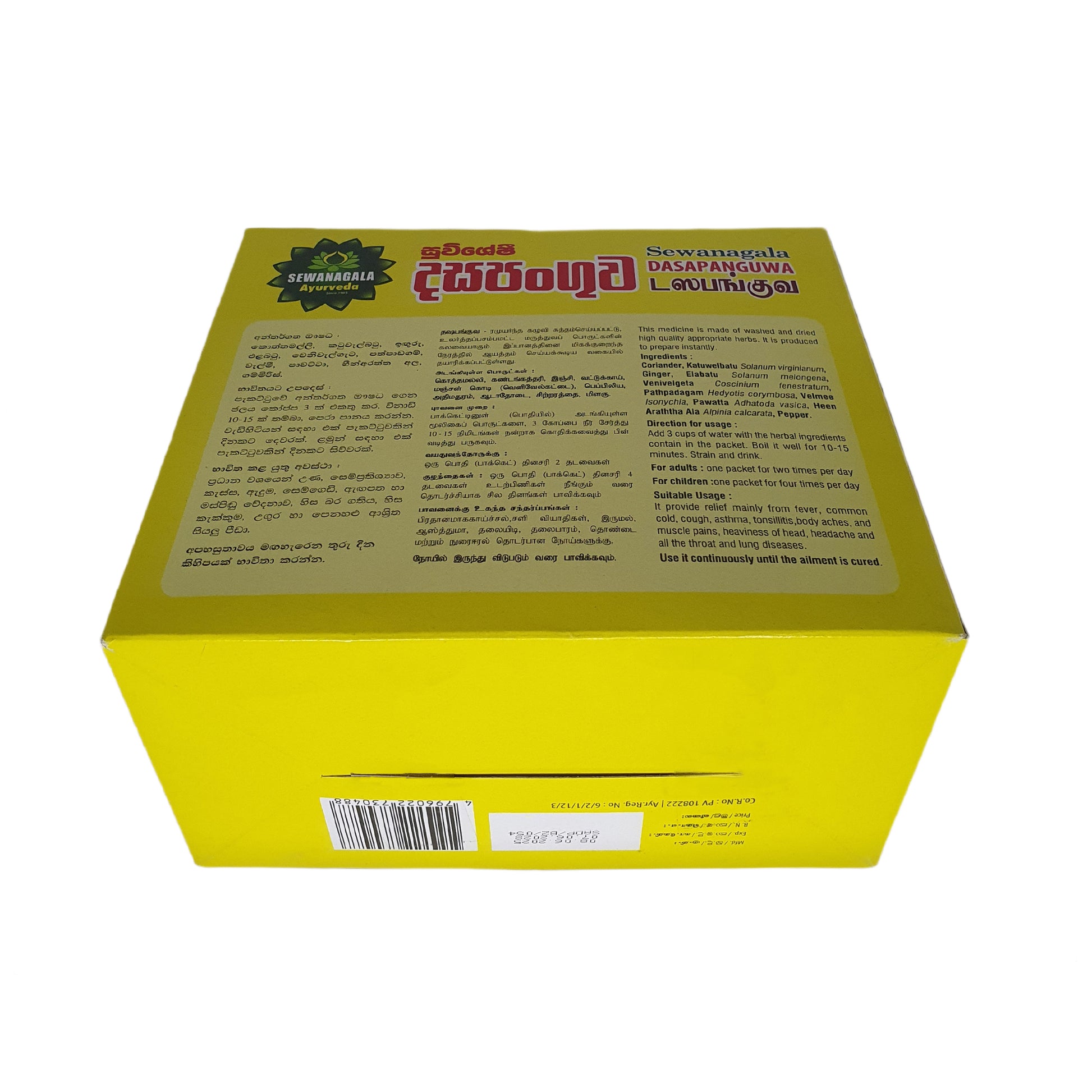 Sewanagala Dasapanguwa (10 Packets) is a traditional Ayurvedic herbal drink made from 10 natural ingredients, including coriander, ginger, and pepper. It helps relieve fever, colds, coughs, body aches, asthma, tonsillitis, headaches, and strengthens immunity. Simply boil one packet in 3 cups of water for 10–15 minutes, strain, and drink.