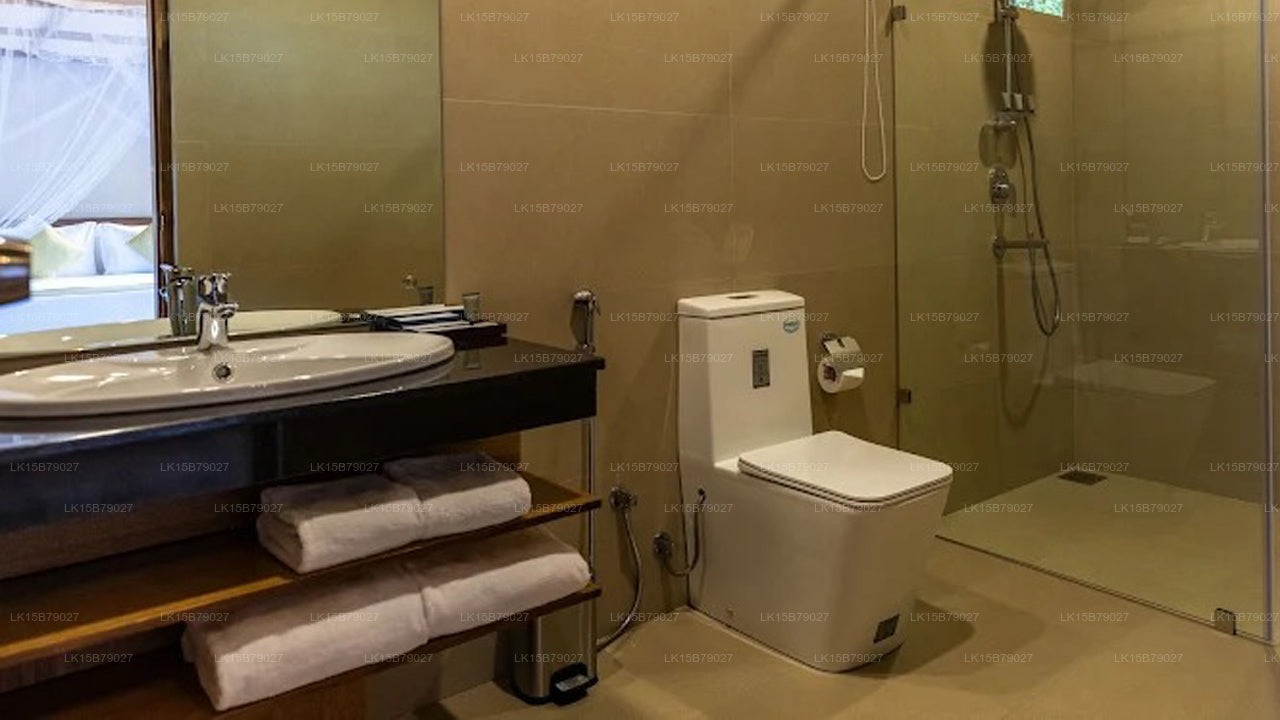 The lodge features eco-conscious cottages and family villas designed to harmonize with the environment. Each unit includes comfortable bedding, en-suite bathrooms (some with outdoor showers), ceiling fans or air conditioning, and private verandas overlooking the forest canopy or Sigiriya’s silhouette.