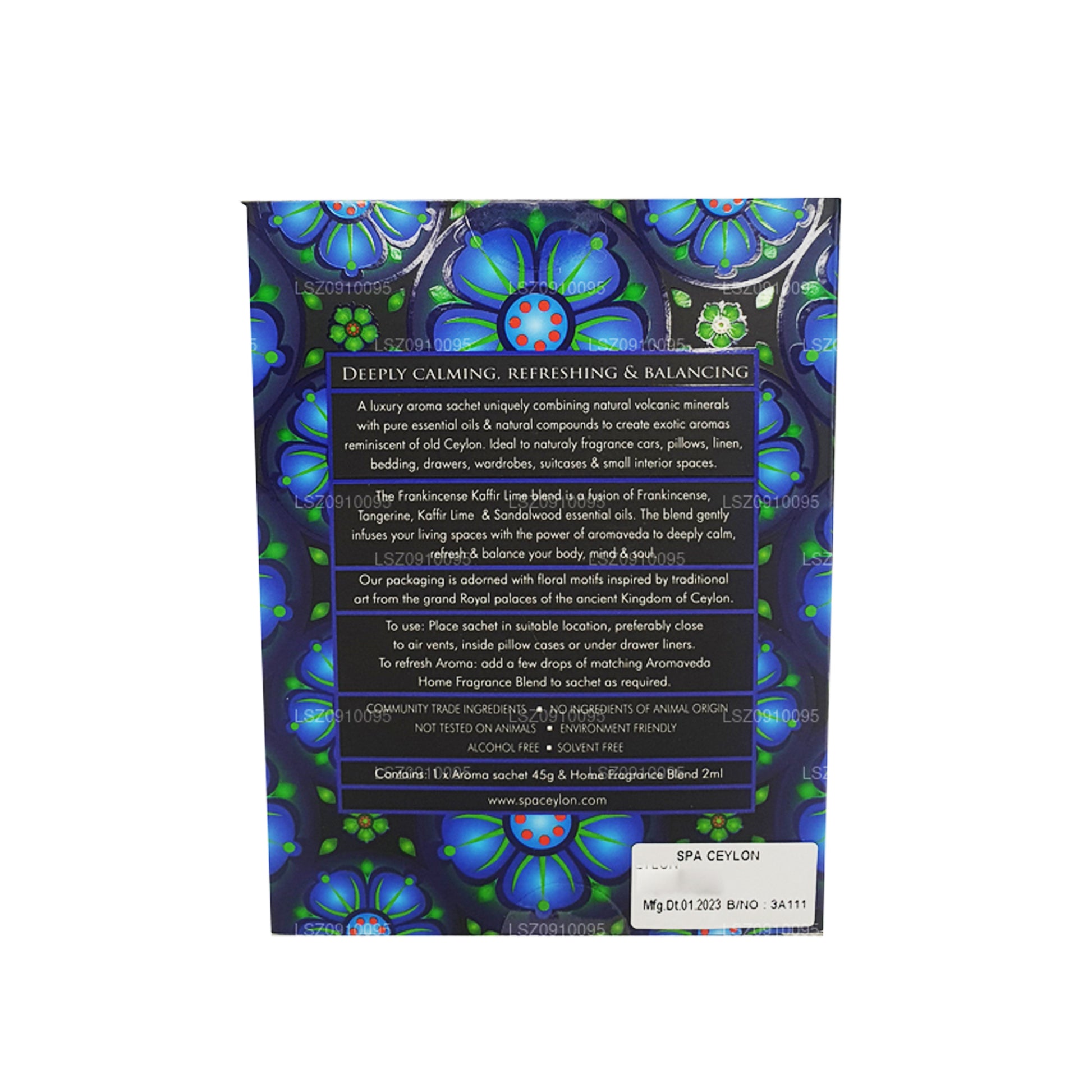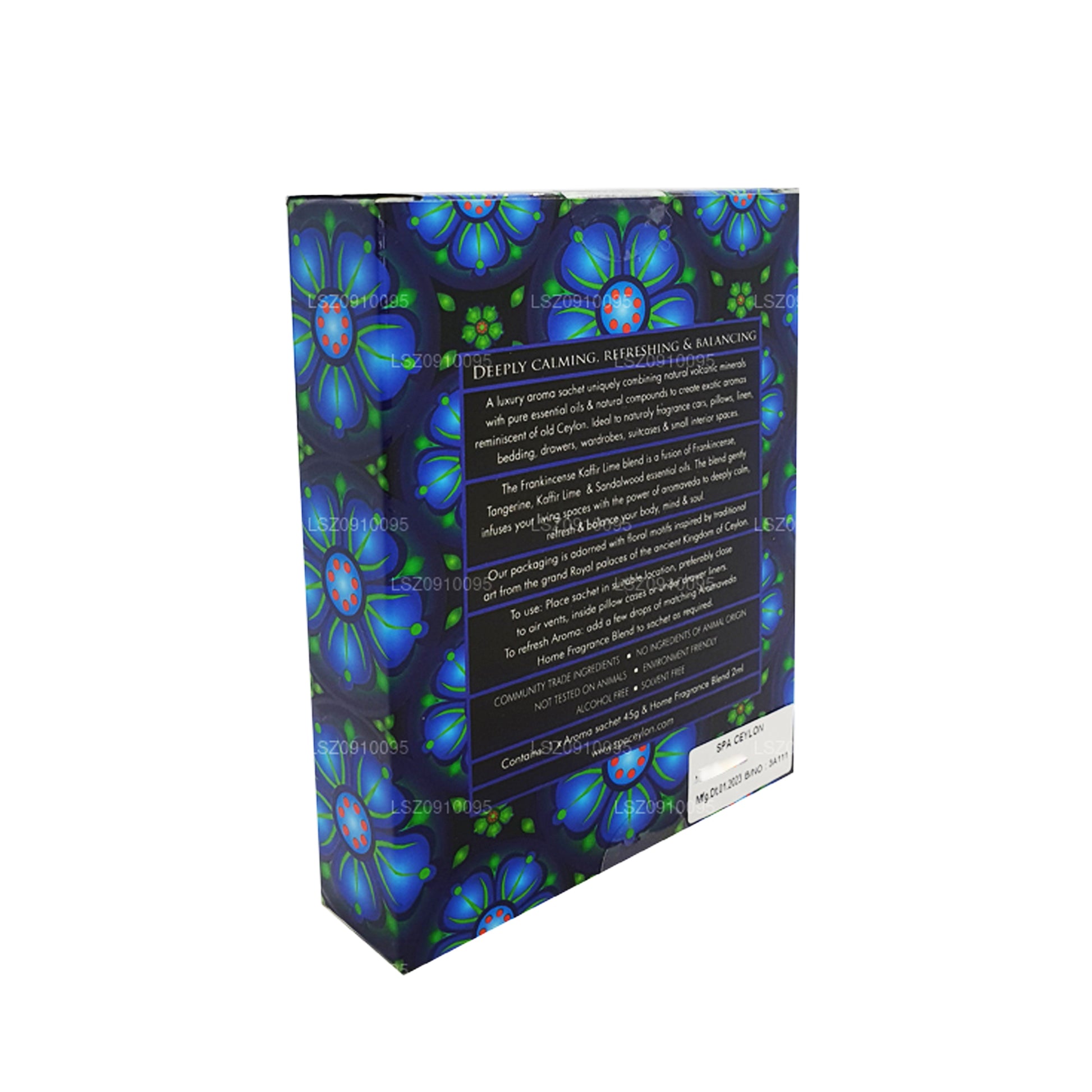 (SKU: LS80007D36) A luxury aroma sachet uniquely combining natural volcanic minerals with pure essential oils & natural compounds to create exotic aromas reminiscent of old Ceylon. Ideal to naturally fragrance cars, pillows, linen, bedding, drawers, wardrobes, suitcases & small interior spaces.The Frankincense Kay Lime blend is a fusion of Frankincense, Tangerine, Kay Lime & Sandalwood essential oils. The blend gently infuses your living spaces with the power of aromaveda to deeply calm, refresh & balance your body, mind & soul.Our packaging is adorned with floral motifs inspired by traditional art from the grand Royal palaces of the ancient Kingdom of Ceylon.
