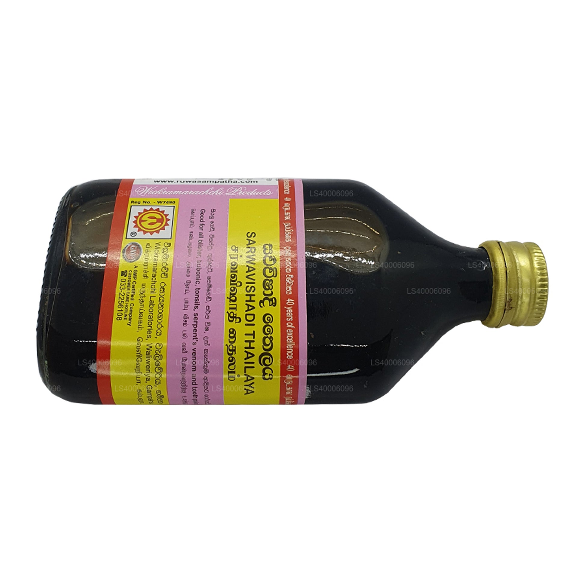 (SKU: LS40004AA5) "Wickramarachchi Labs Sarwa Wishadi Thailaya" is a traditional herbal remedy formulated to counteract the effects of poisoning. Developed by Wickramarachchi Labs, this product is based on Ayurvedic principles and contains a blend of natural ingredients with detoxifying and antidote properties. It aims to support the body's detoxification processes and neutralize the impact of toxins, promoting overall well-being. However, it's important to note that this remedy should be used as a complementary measure and not as a substitute for immediate medical attention in cases of severe poisoning. Consulting a healthcare professional before use is recommended.